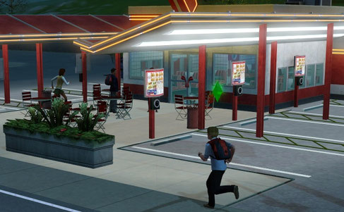 お腹がすいたから、ハンバーガーショップで食べよう。ドライブスルーもあるね。