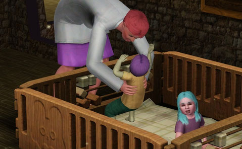 同じ世帯のこの子たち、来るときはベビーシッターシムが抱っこして連れてきたけど。お迎えは保護者の彼女一人だけ。どうやって連れて帰るのか黙って見ていたら、残った方の子もその後フッと消えました。一緒におうちに帰れたようです。