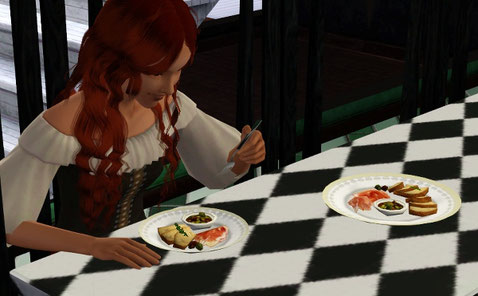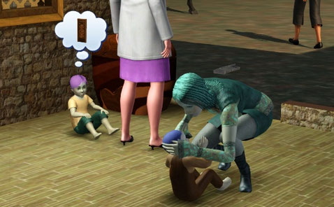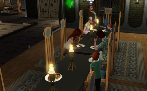 途中で大きなお屋敷の前を通ったら、中からにぎやかな声が聞こえたので、そのまま訪問してみました。中にはたくさんシムたちがいました。