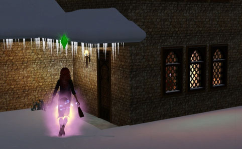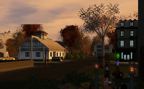 夕暮れどき。本屋の前によくシム達が集まってきます。といっても夜になると暗くて見えません。