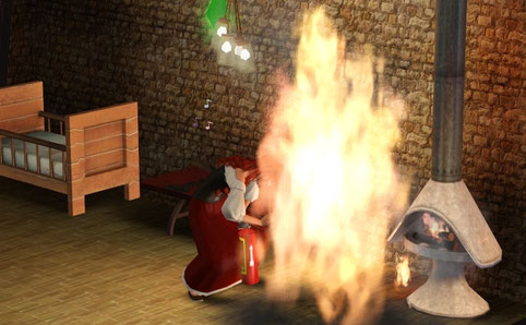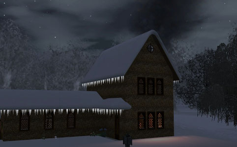 チェルシーの家です。暗くて見えづらいけど、えんとつから黒い煙が上がり、窓から炎が見えます。
