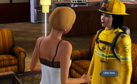 しかも、部屋に消防士の彼がいるのに恥ずかしいな。こちらの女性消防士は、NPC でよくお世話になる、Lillan Gore (リリアン・ゴア) ですね。