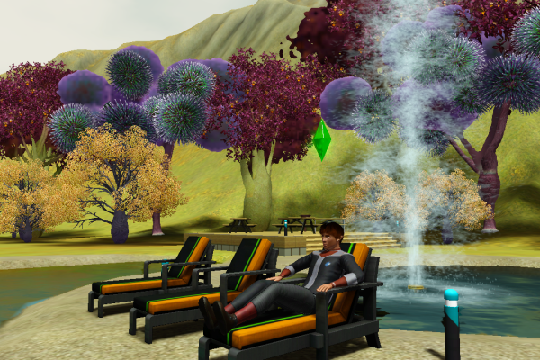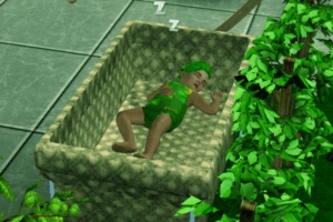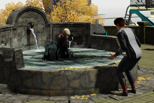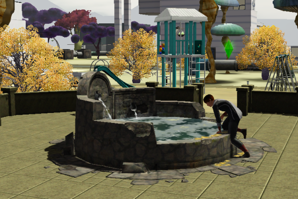 (この泉のアイテムで子供を願うとどんなシムがでてくるのか試したかったので、この流れにしました。赤ちゃんシムがくる時もあるようですが、今回は小学生シムばかり現れました)