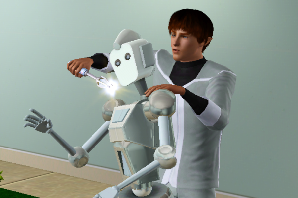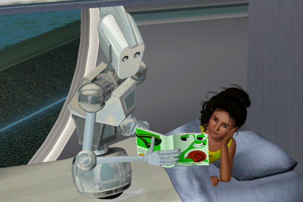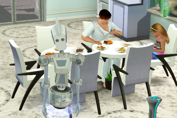 家事ロボットも、まだ「子守」がわからないので、一般のシムのベビーシッターを呼んで、協力してもらいました。