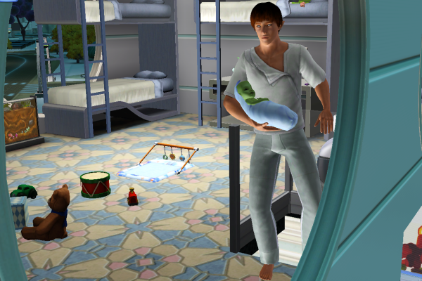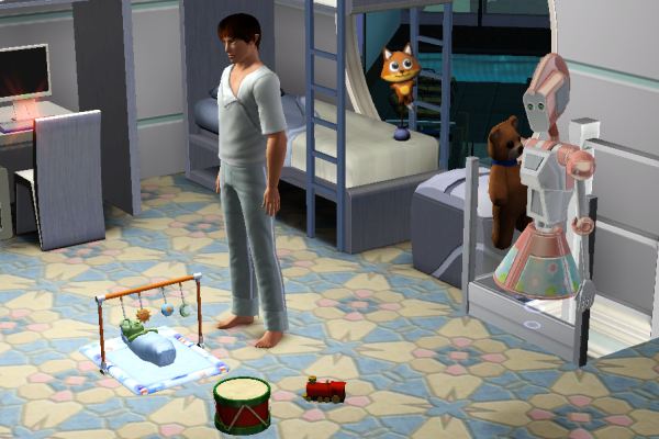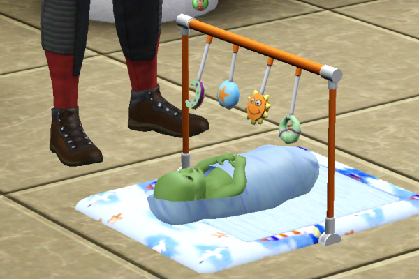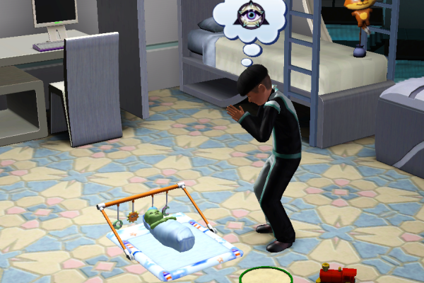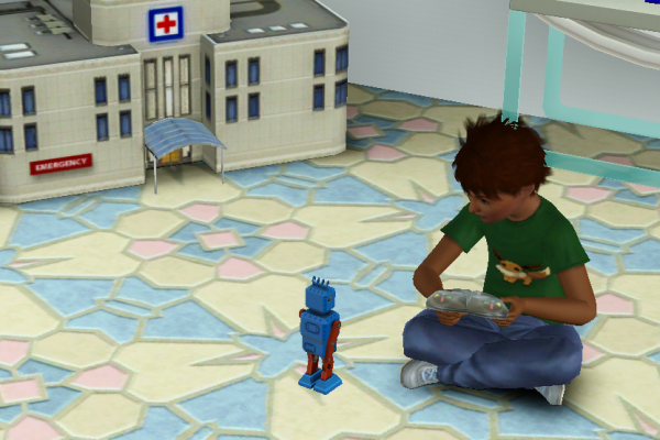 「悪い」特質があっても、子供シムの普段の生活は子供らしく、おもちゃで楽しく遊んでいます。