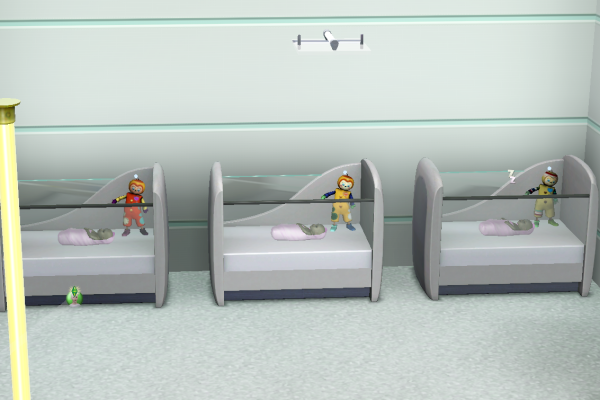 バービーは子育てに興味がなく、すぐ仕事に行きたい様子。科学者たちが研究室で彼女を待っています。