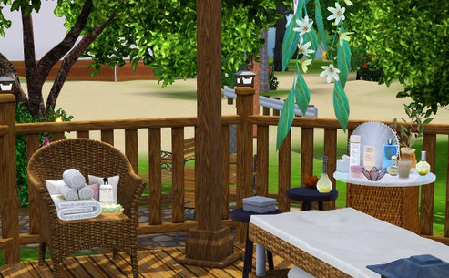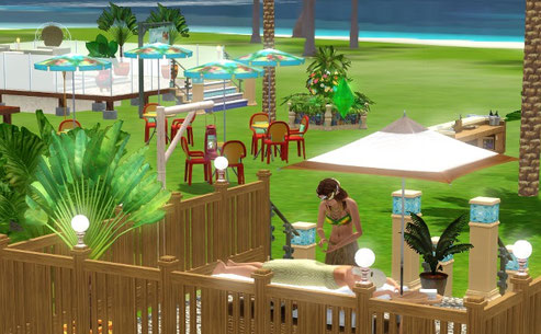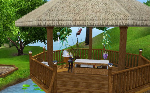 自作の公共施設です。といっても、アイランドパラダイスの施設を一部コピーして、ホットバスやマッサージを追加したものですが。バーカウンターも置いて、ここを憩いの広場にします。