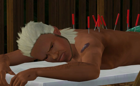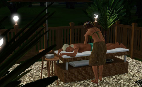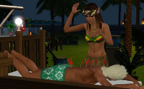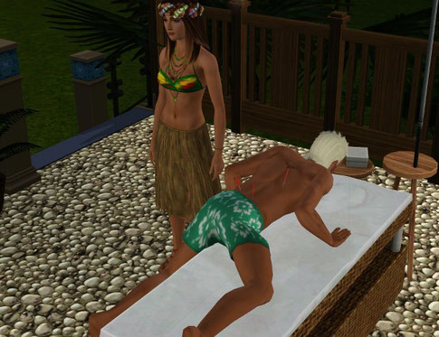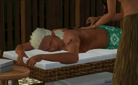 マッサージメニューでハリのリアクションは楽しいんだよね。寝ているシムはすごく痛そうな顔しているけど。
