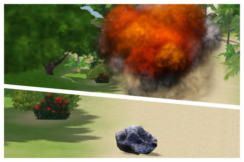 家に落ちたりシムに命中すると悲惨だけど、今回は普通の爆音ですみました。区画外なので特に地面がへこんだりもせず、普通に隕石が残っていただけ。