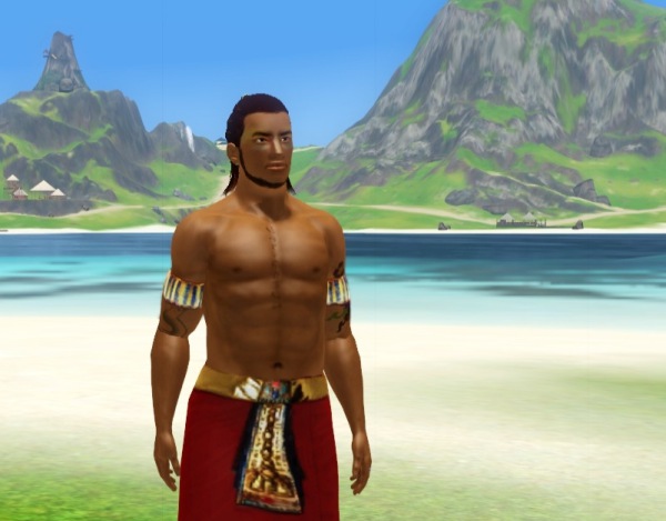 今、彼につけてるのはデフォルトの適当なデザインです。作った当時は、なんとなくポリネシアン風にと、お飾りでつけただけですが、今見ると、ダサいね。
