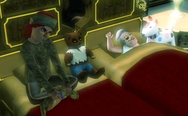 (このプレイは私が管理してるので大丈夫ですが、シムの世界は厳しく、ゲームで幼児や子供シムに問題が起きたり粗末に扱うと、ソーシャルワーカーに連れて行かれ、世帯から切り離されて会えなくなるので注意しないとね)