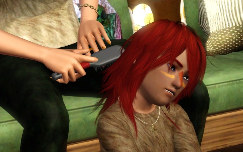 髪がもつれて、ブラシが通りません。頭に巻いたバンダナを、ちょっと外してみよう。