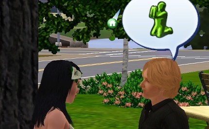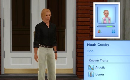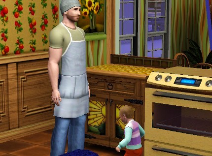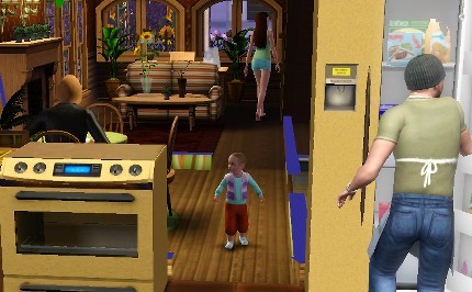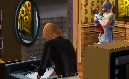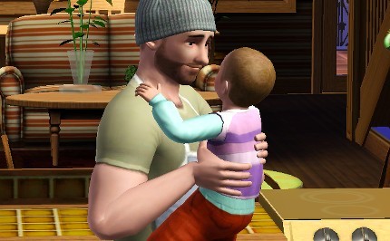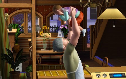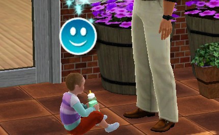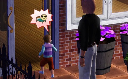親シムが戻ってくる時間なのでしょう。一瞬あせったけど、プログラムの都合と思います。大人が戻ればまたアイコンが出てきて、部屋の中に坊やの姿も見えるはず。