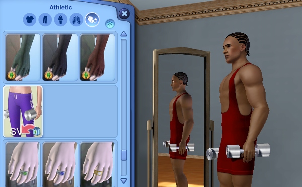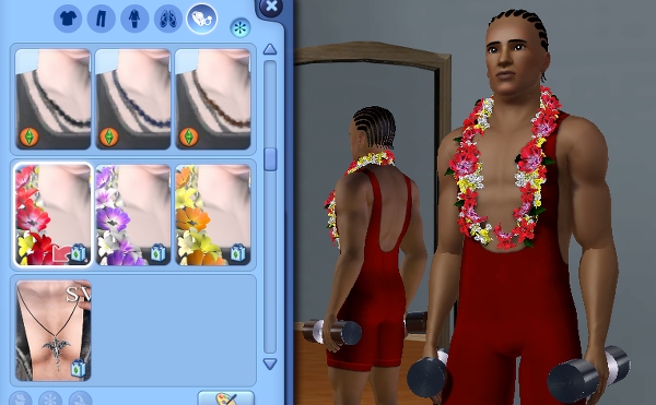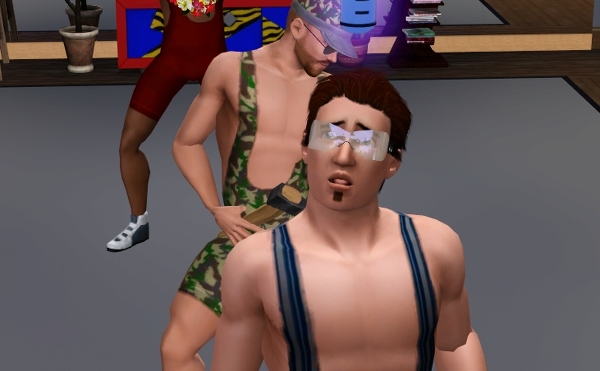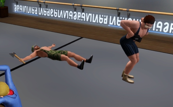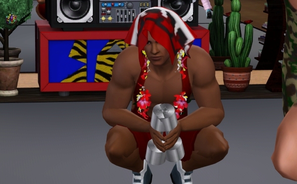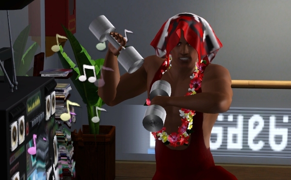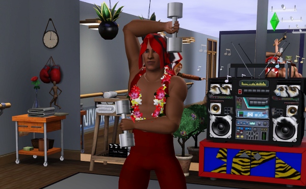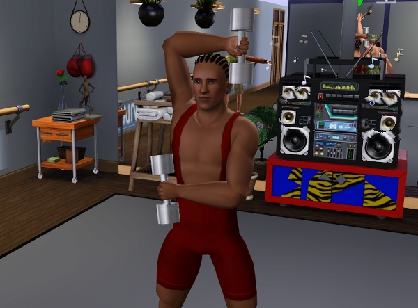 ジョージのダンベル、アスレチックなシムにはぴったりの小道具です。軽々とふりまわしてるけど、 ひとつ 5kg って表示までされてます。