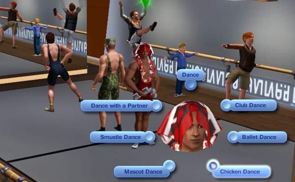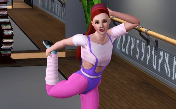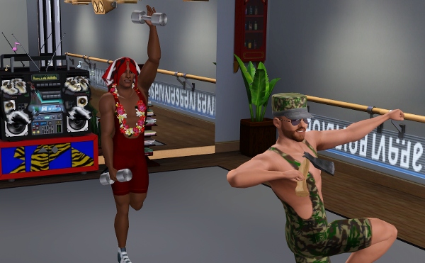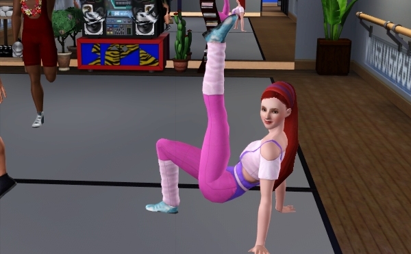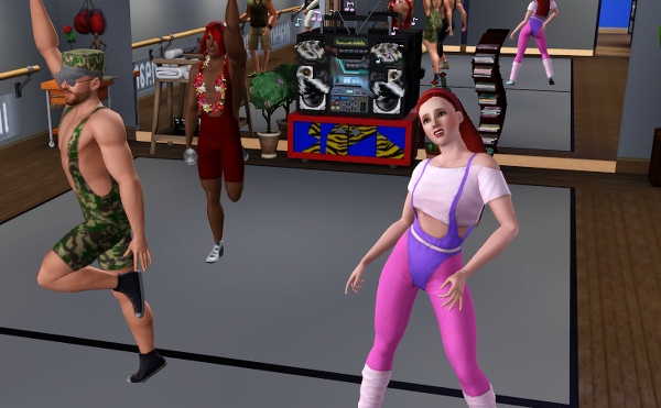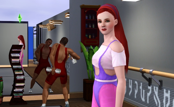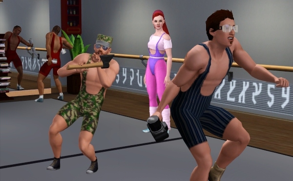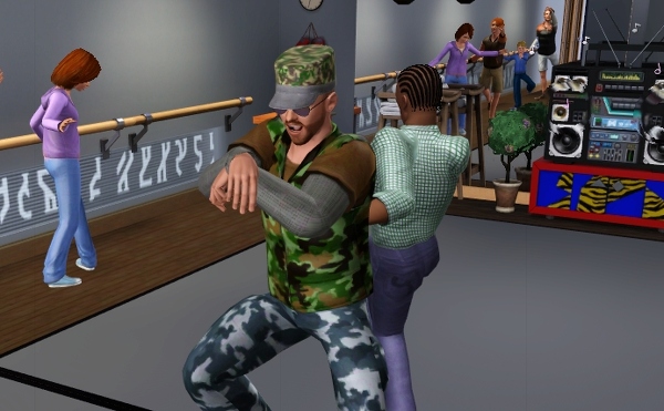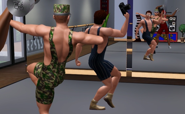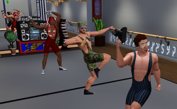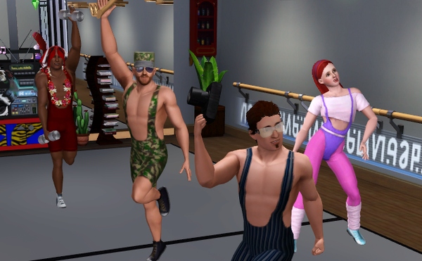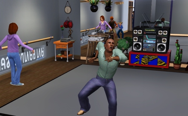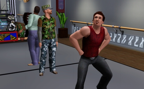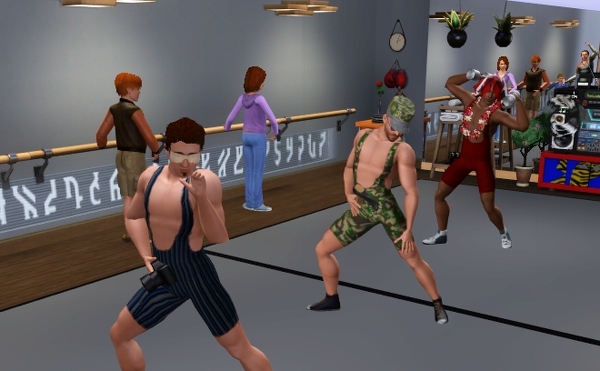 公共施設なので、他のシムたちも遊びにきてます。壁側には、なぜか男ばかりでバレエの練習しているファミリーが見えます。