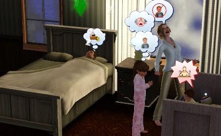 真夜中。ちびすけが夜泣きするので、4人一緒の部屋に寝ていたお母さんと娘は、目が覚めてうるさーいと困ってます。