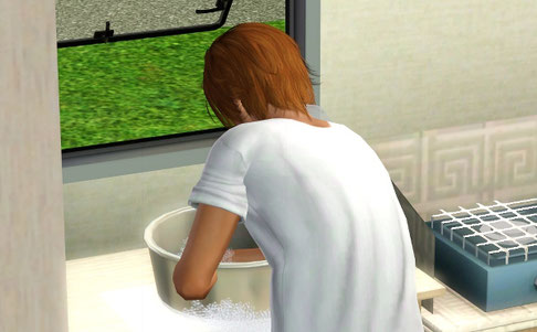 愛用のカスタムコンテンツの洗面器です。水道代わりにここでジャバジャバ。