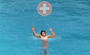 いた ! ちょっとぉ〜、本当は泳げるんでしょう。溺れ方がわざとらしい。