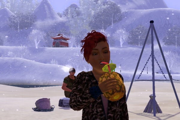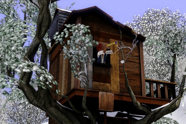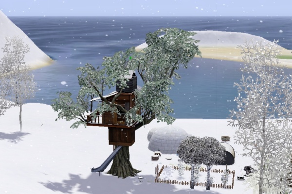 あまりにも寒いので、盗賊のあんちゃんが見るに見かねて、流木でツリーハウスを作ってくれたことにします。