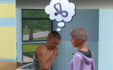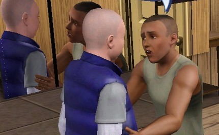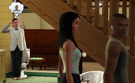 Bella の家に遊びにきたら、なぜかマイケルがトイレから敬礼。その姿、なんかおかしい。
