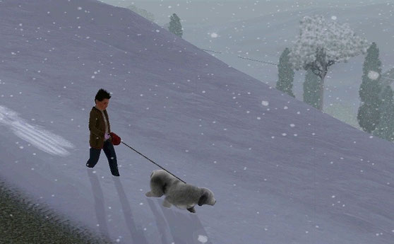 街を見渡すとこんな光景がありました。これいいな、フリーウィルで犬をおさんぽさせてるシム、しかも子供が。初めてみた。
