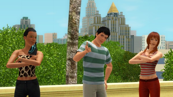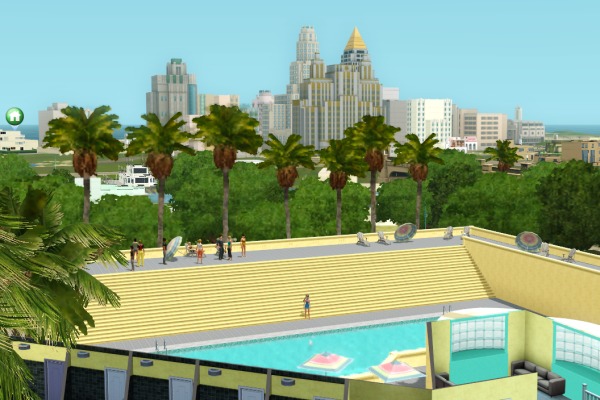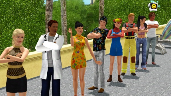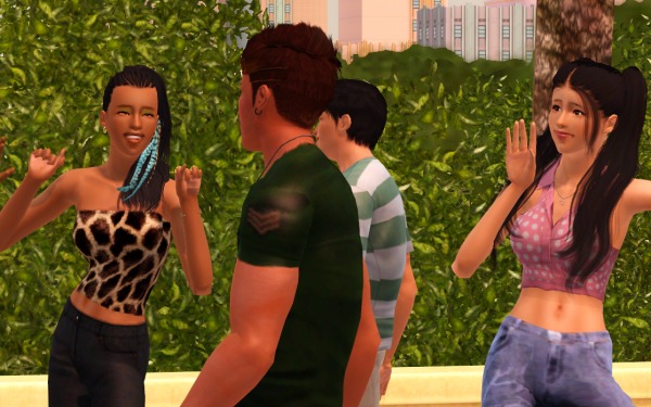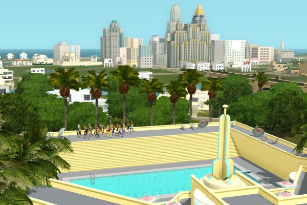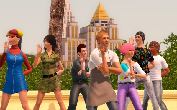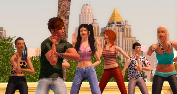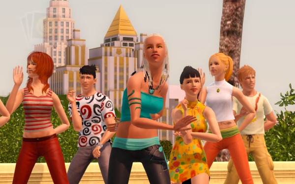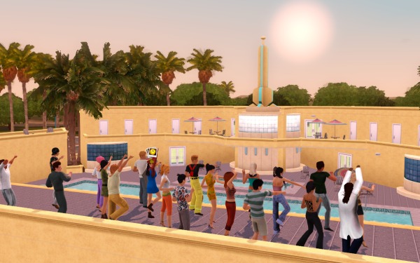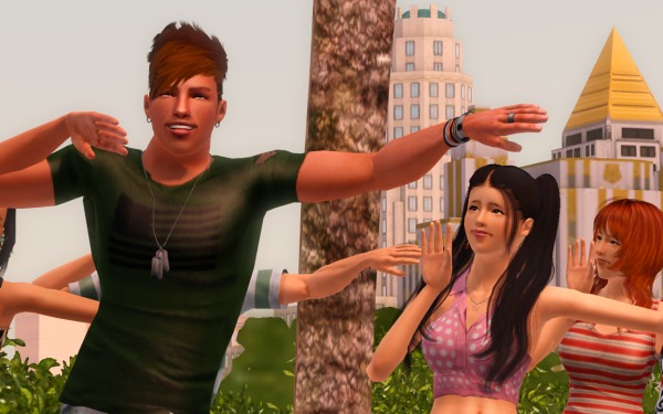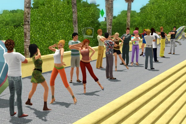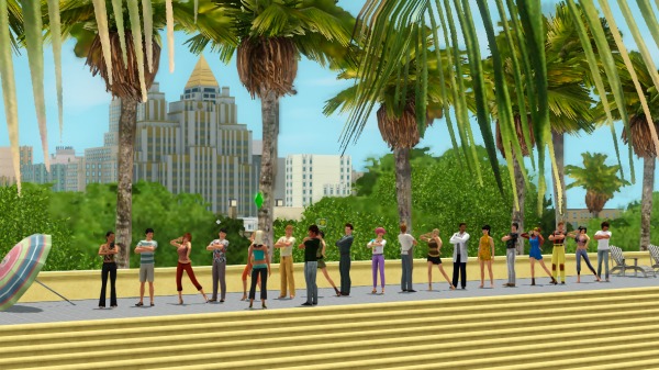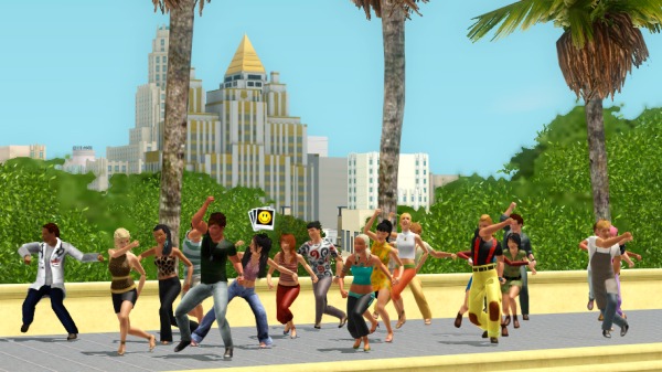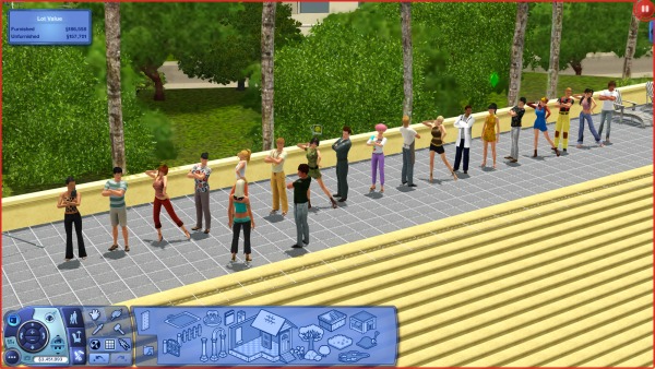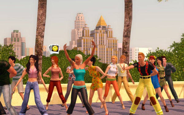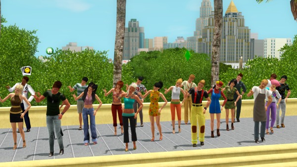 (裏でカチカチとコマンドをクリックして作業中。シムたちを順番にポーズとめてMMDスタート、それを20回ずつアナログで実行させるって、毎度オタクなシムズプレイ… 古いゲームですから)