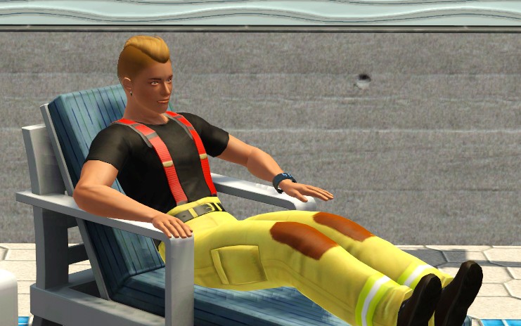 おっ、消防士のおにいさんが休憩中。水のそばでホッとひと息。
